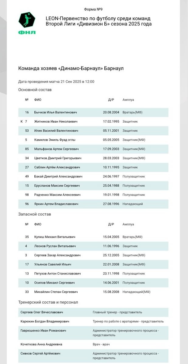 ПФК «Динамо-Барнаул» прошел аттестацию Футбольной национальной лиги