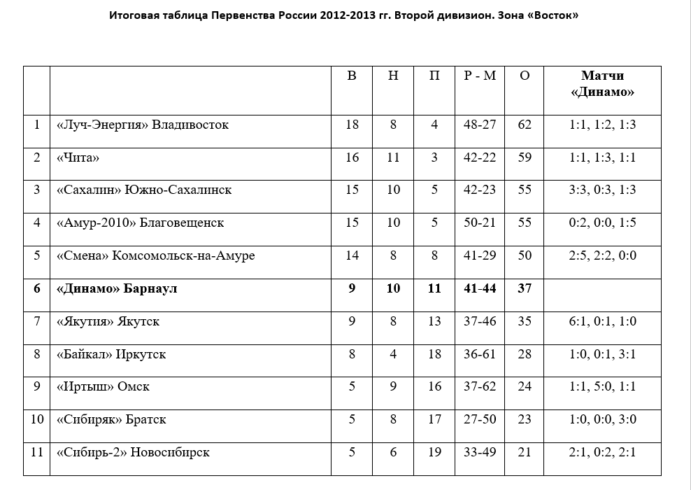 По итогам сезона чемпион «Востока» новокузнецкий «Металлург-Кузбасс» занял в ФНЛ 15 место и сохранил за собой право выступать там же и в следующем сезоне, но не прошел лицензирование из-за долгов и потерял свой профессиональный статус, как и наше «Динамо» в зоне «Восток». РФС не пошел на уступки и отказал барнаульцам, так как футбольный клуб не смог предоставить документа об отсутствии невыполненных обязательств. Ранее 12 динамовских игроков недовольных ситуацией с выплатой обещанных премиальных не подписали его. Поэтому барнаульское «Динамо» с августа 2013 года вынуждено было играть в чемпионате Сибири среди любительских клубов. Об этом сезоне подробно будет написано уже в следующей нашей публикации.