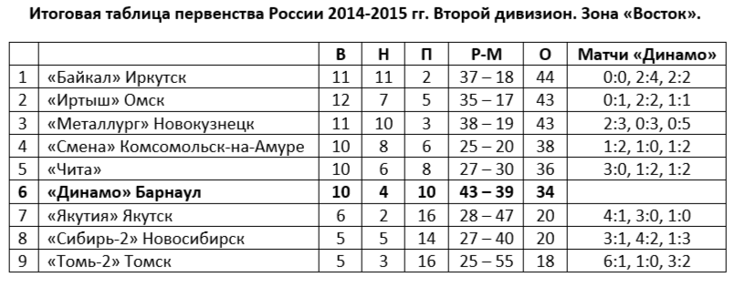 В Первом дивизионе (ФНЛ) в сезоне 2014-2015 гг. играли пять барнаульцев – вратарь Даниил Гавиловский (1990) в «Химике» (Дзержинск) провел 16 матчей, защитники – Александр Жиров (1991) в «Волгаре» (Астрахань) – 32 (1 гол), Константин Гарбуз (1988) в «Енисее» (Красноярск) – 32, Сергей Нестеренко (1986) в «Тосно» (Ленинградская обл.) – 1. Нападающий Антон Кобялко в «Газовике» (Оренбург) – 34 (6 голов).