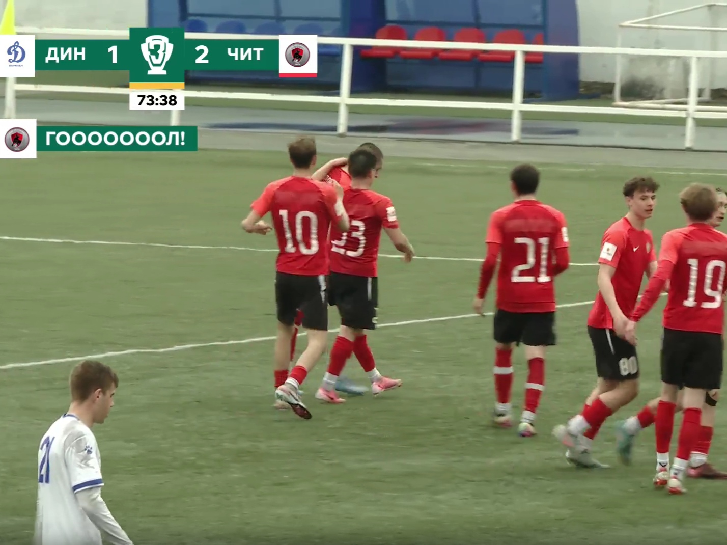 После перерыва тренер динамовцев Сергей Нарылков сделал сразу пять замен, так как с тренировки ко второму тайму подоспели ребята из главной команды. Они хорошо вошли в игру, преимущество динамовцев стало полным и на 68-й минуте они сравняли счет. Это вышедший вместо Никиты Андраховича Иван Гордейчик отдал из глубины поля изумительную вертикальную передачу в штрафную площадку читинцев на Александра Красильникова, который сделал опасный прострел. Защитник гостей в падении отбил мяч к линии штрафной площадки, где Александр Егоров на подборе мяча оказался первым, обыграл бросившегося наперерез ему соперника и с бильярдной точностью низовым ударом словно в лузу уложил мяч в правый от себя угол ворот «Читы» – 1:1.